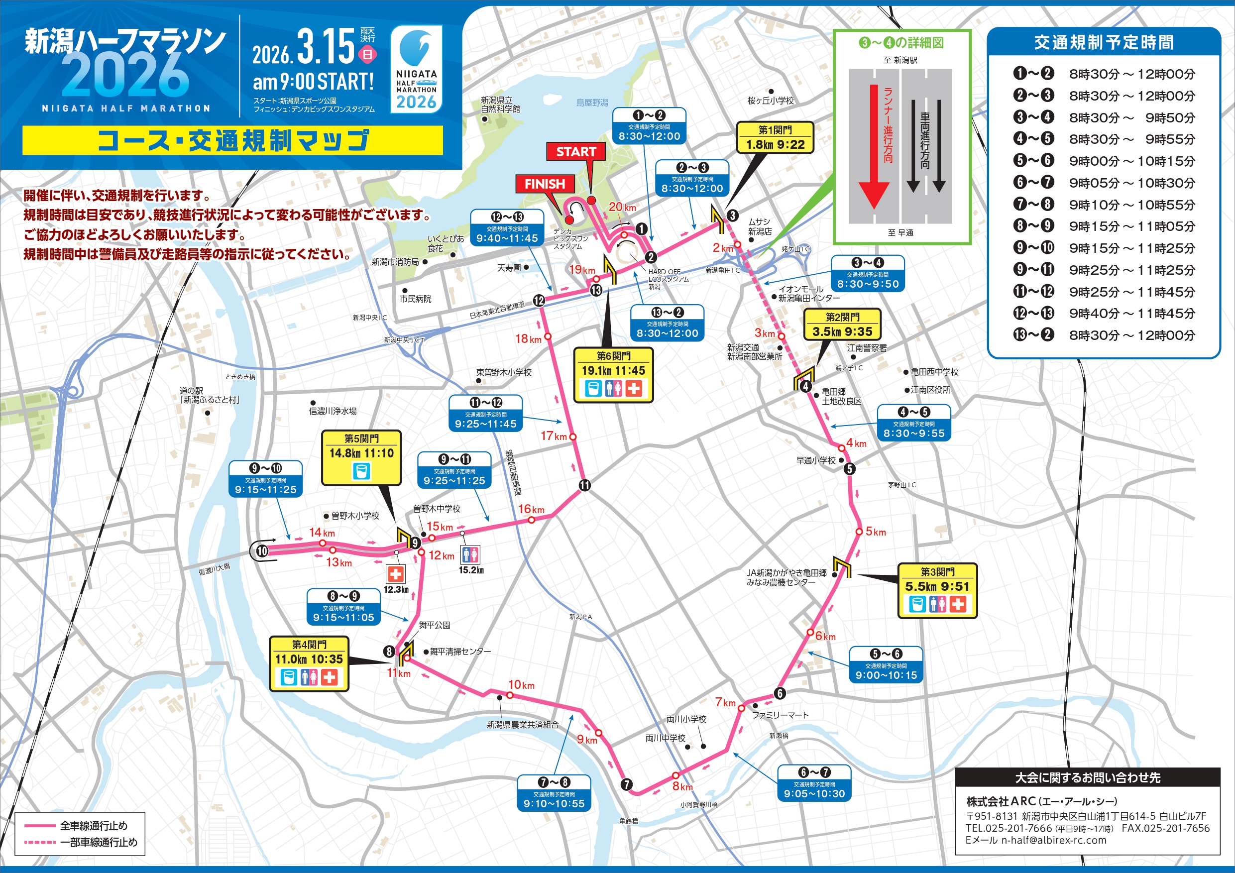 また、規制時間中は警備員及び走路員等の案内に従ってください。